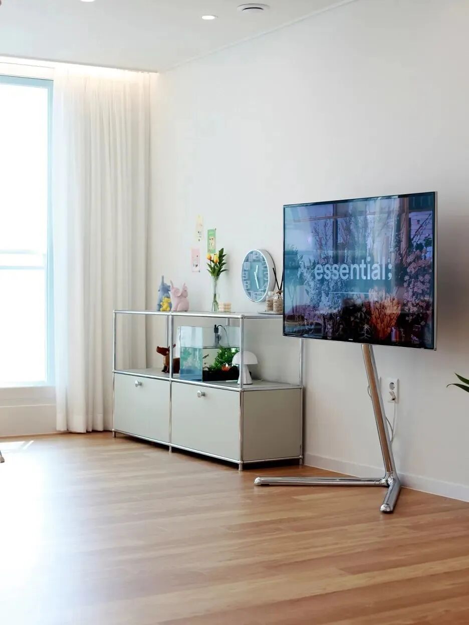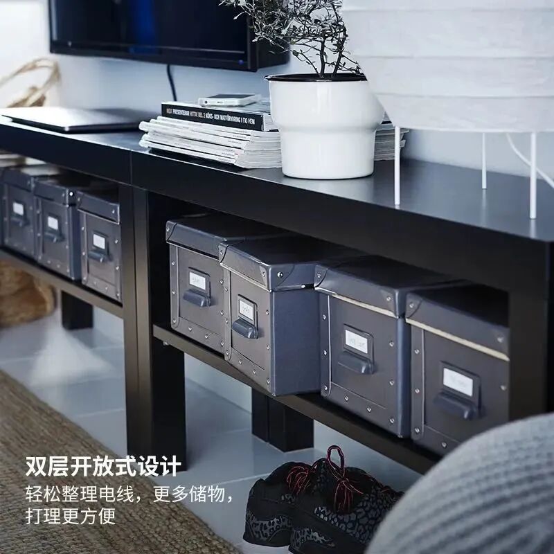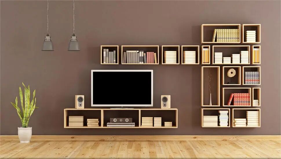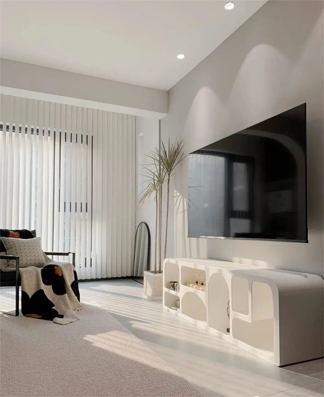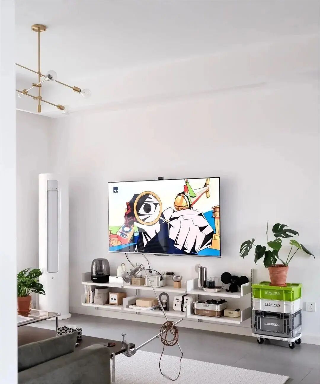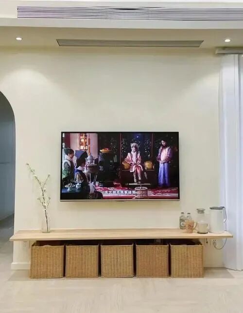 比成品电视柜还实用单元格书架用单元格书架代替书架并不庸俗,可以完全满足上述电视“外设”的存储需求,也可以根据自己的喜好搭配,所以你不必担心千篇一律。担心灰尘可以直接搭配收纳盒。一定要注意收纳箱的尺寸。最好在同一家商店购买,通过这种方式,尺寸完美匹配。宽搁板+藤编收纳盒从互联网上定制一个带有4或5个储物篮的木架,可以拥有更多的收纳位置。安装也很简单,使用膨胀螺丝就可以。搁板最好比插座高,当被推入时,储物篮可以挡住杂乱的线条。电视柜平替“边柜”壁挂电视不需要具有强大存储功能的电视柜,只需要放置立体声、摄像头、机顶盒等,旁边放一个侧柜就足够了。只要它具有与侧柜类似的功能,就可以使用,如手推车、儿童书架、装饰柜、杂志陈列架、储物箱等等装饰柜 & 杂志陈列架▼如果你选择了储物箱,建议你选择一个用于户外野餐的储物箱。侧面可以打开,拿东西很方便。DIY长凳可以买成品长椅,DIY也可以节省更多的钱。选择木板+凳子腿+钉子,购买并自行安装。确认离地高度,不要堵塞插座;不能太短,为清扫机器人预留空间,以便于清洁。这种双层凳也不错,搭配收纳盒,不担心落灰,底部是空的,打扫不费事。墙面置物架东西不多,但必须有一个电视柜来放零碎的东西,墙上的架子正好。搁板搁板真的是一个多用途的典范,你可以通过改变大小并有序地排列它们来获得不同的感觉。没有储物需求,选电视支架落地支架落地支架可以随意移动,如果有一天你想改变客厅的布局,就可以很方便的进行更改。客厅杂物少的效果▼客厅摆件多的效果▼购买支架时,要注意预先确定电视机背面的尺寸、重量、孔间距和数量,以查看支架是否匹配。旋转支架除了落地支架,你还可以在线定制旋转支架。它可以360度旋转,无论你在哪里看电视或玩游戏,都可以找到一个好的角度。用电视机挡住插座如果你决定安装一台电视,想要达到从正面看不到插座的效果,请在水电转换阶段将插座放在电视可以遮挡的位置。壁挂收纳盒水电改造阶段没有计划。如果你以后想解决这个问题,你可以为壁挂式路由器购买一个专用的存储盒。