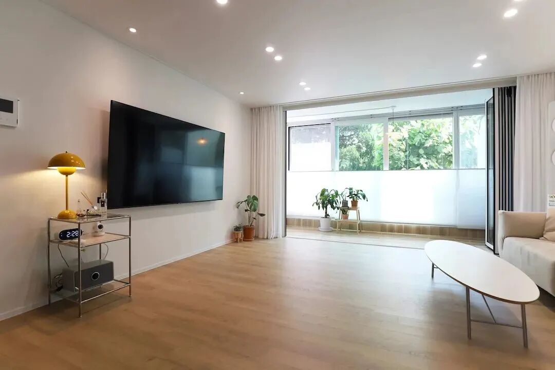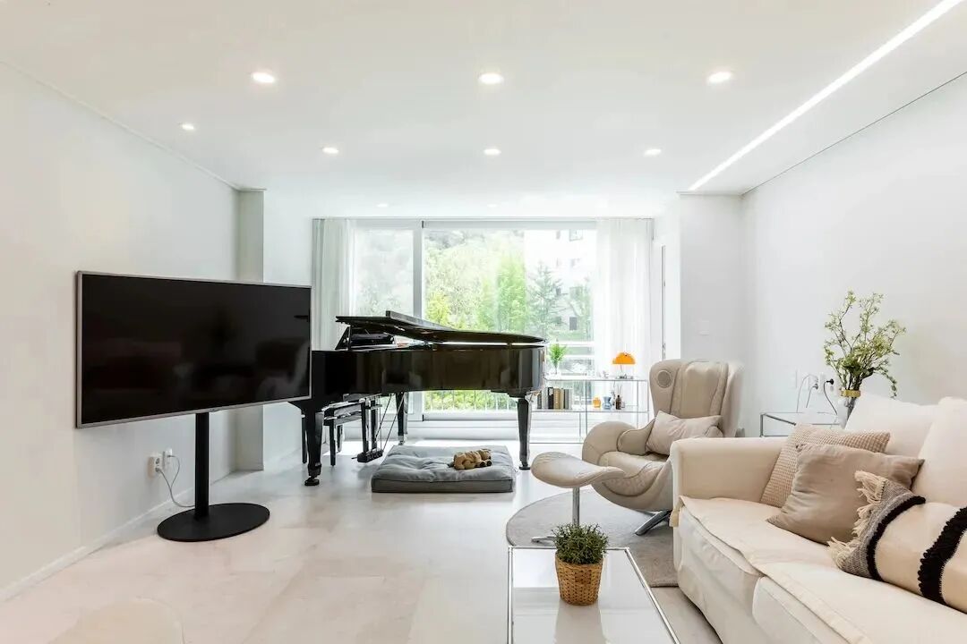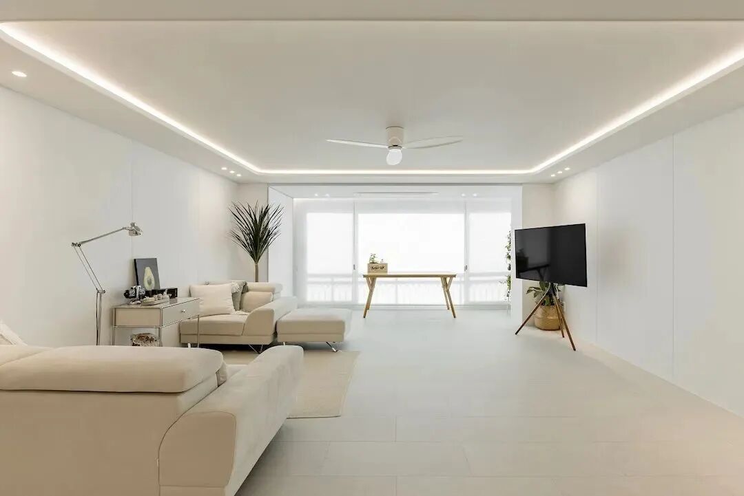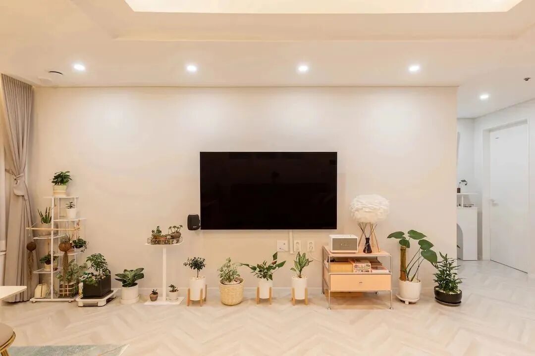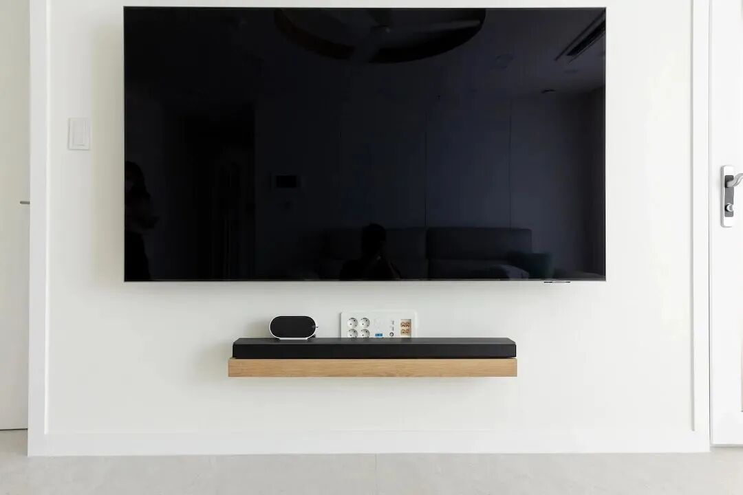 如果你决定安装一台电视,想要达到从正面看不到插座的效果,请在水电转换阶段将插座放在电视可以遮挡的位置。