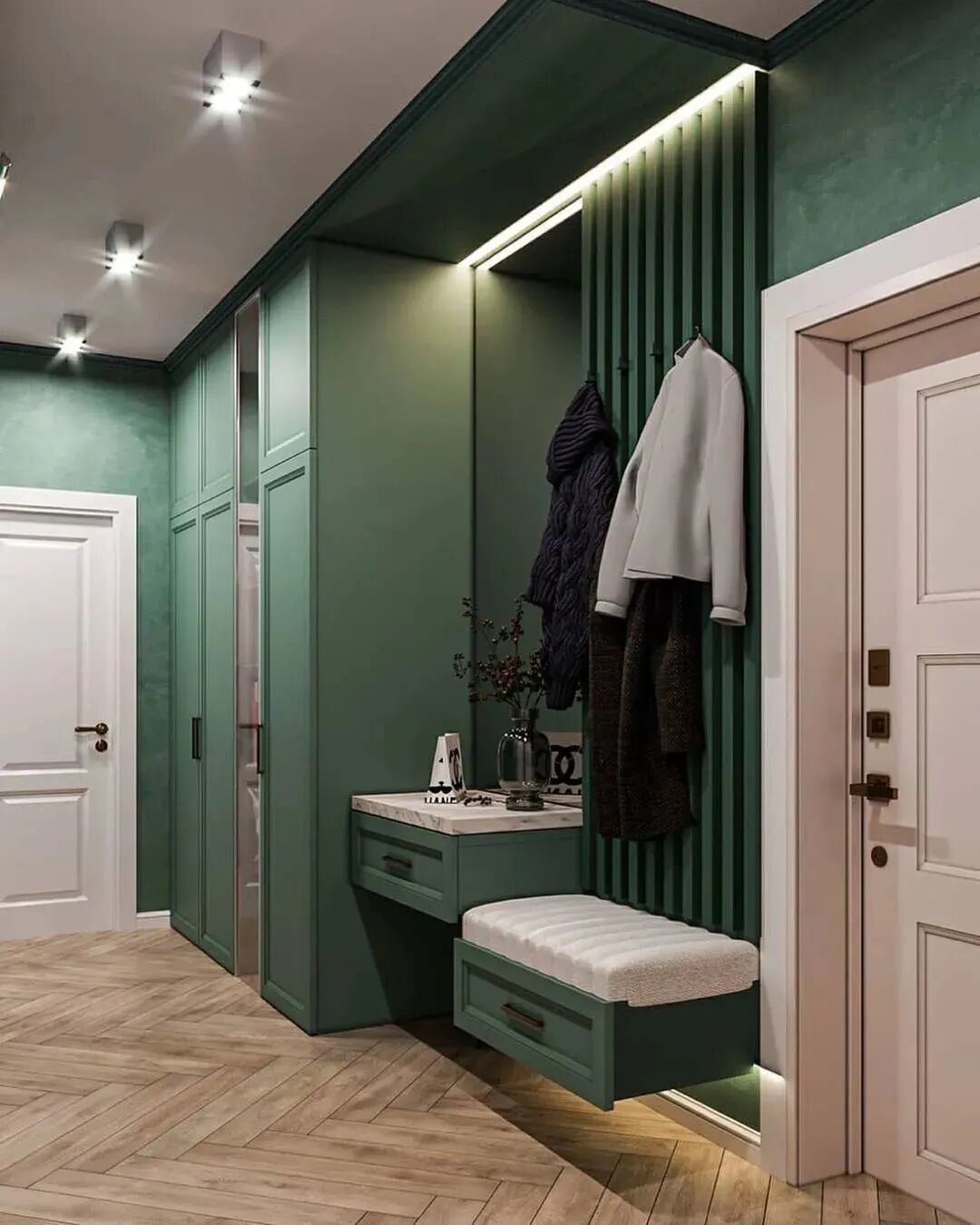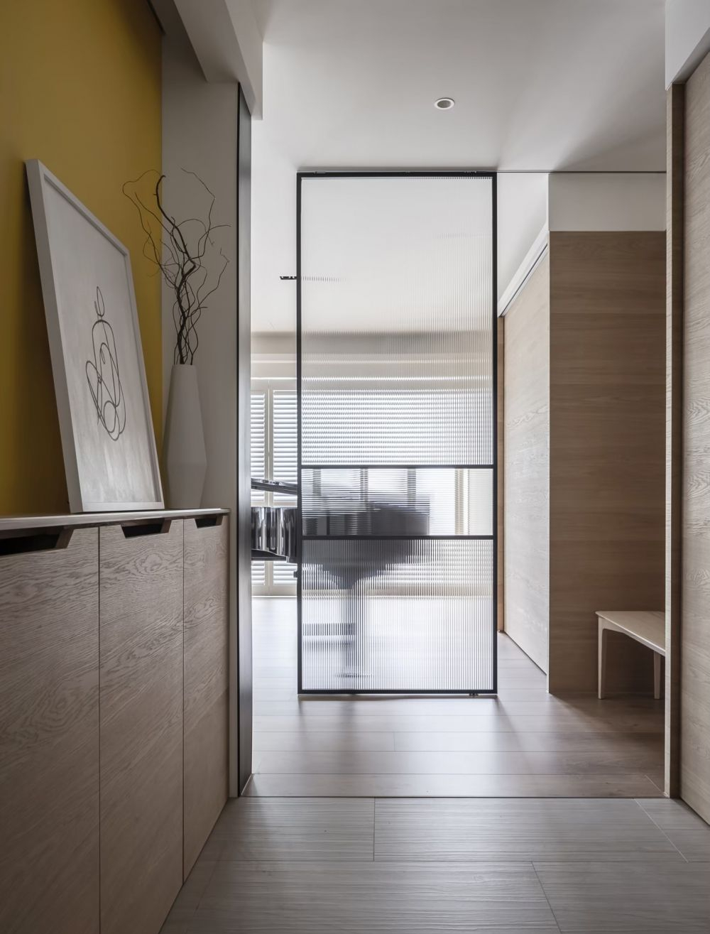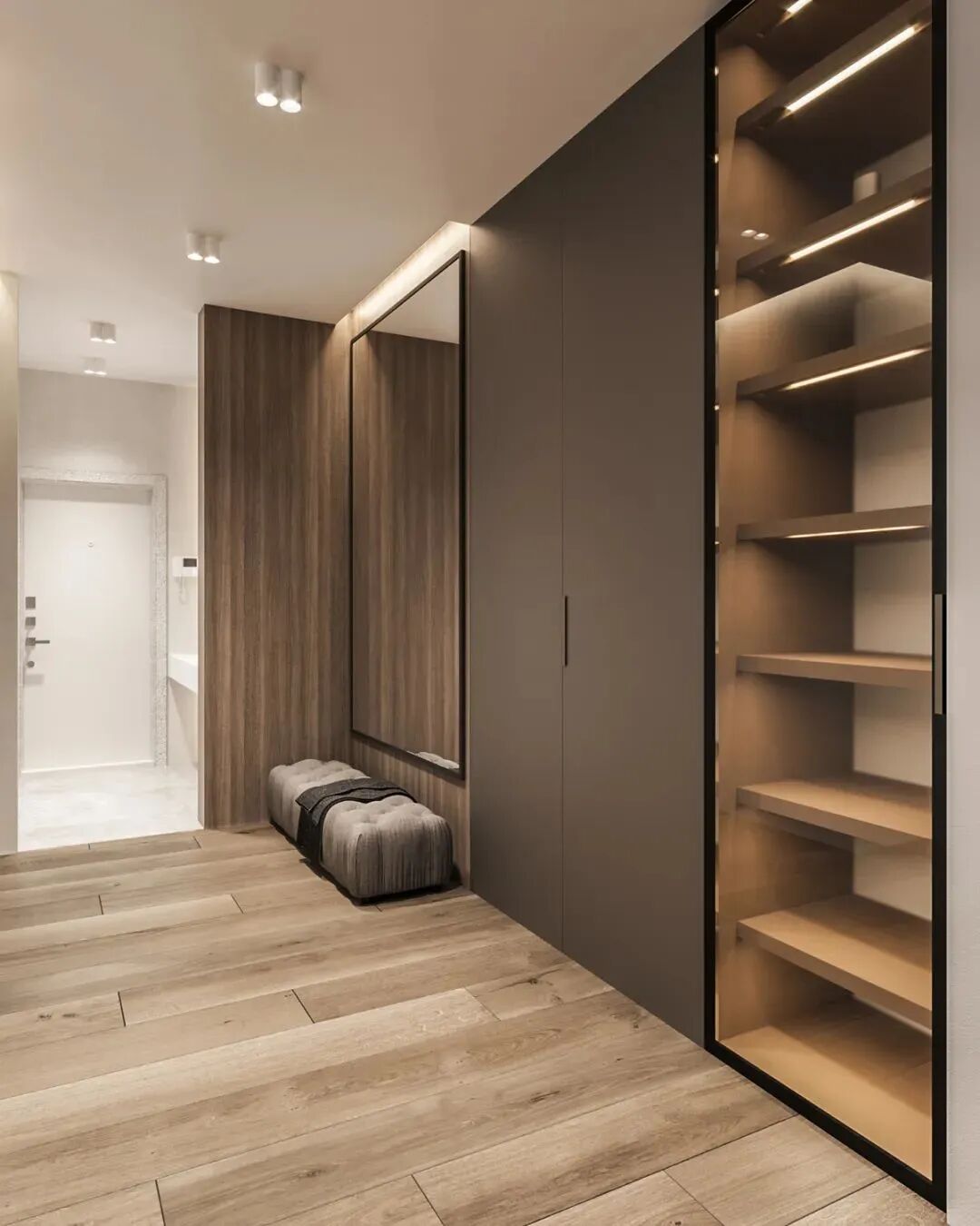 如果玄关形状狭长,那可以在侧边定制鞋柜,嵌入换鞋凳。简单地说,就是将换鞋凳和定制柜组合,使用方便,视觉统一。