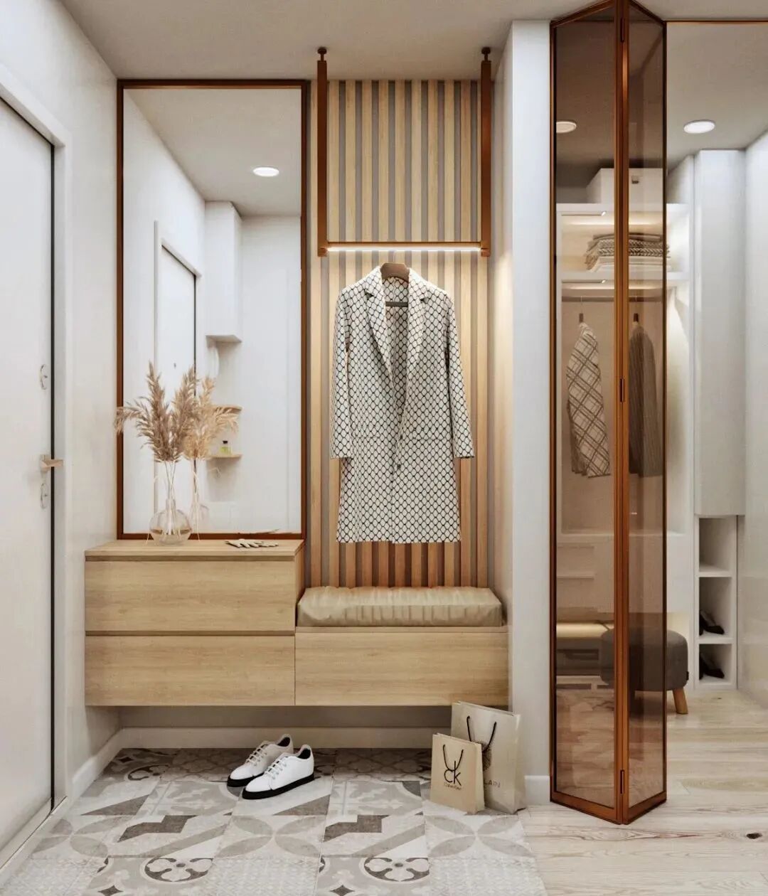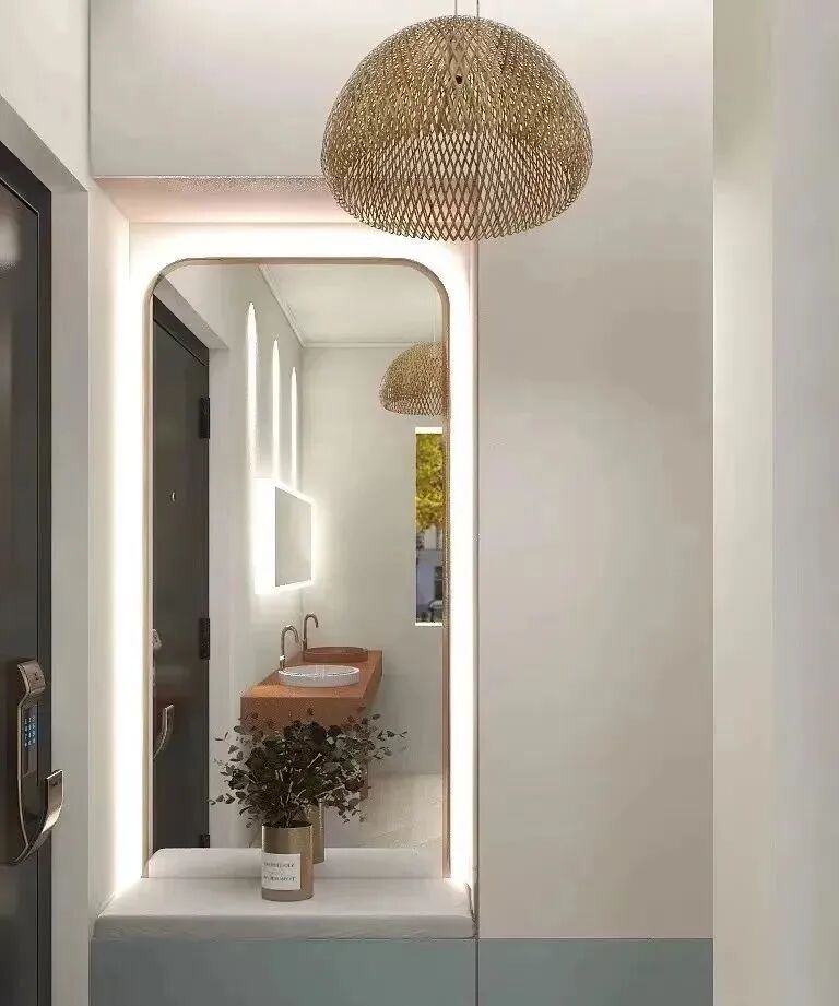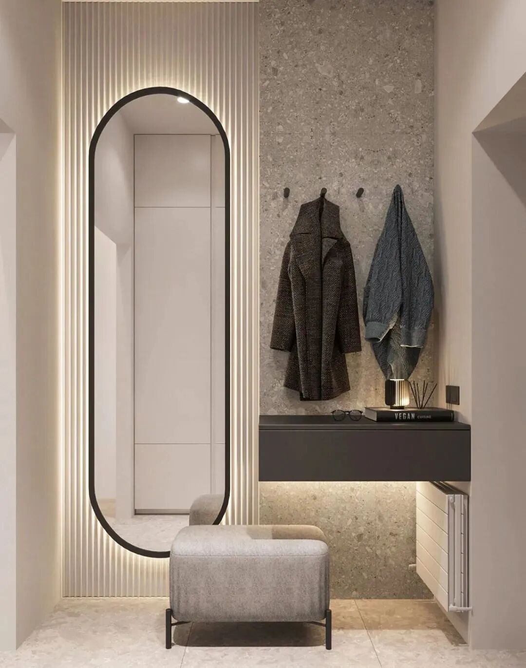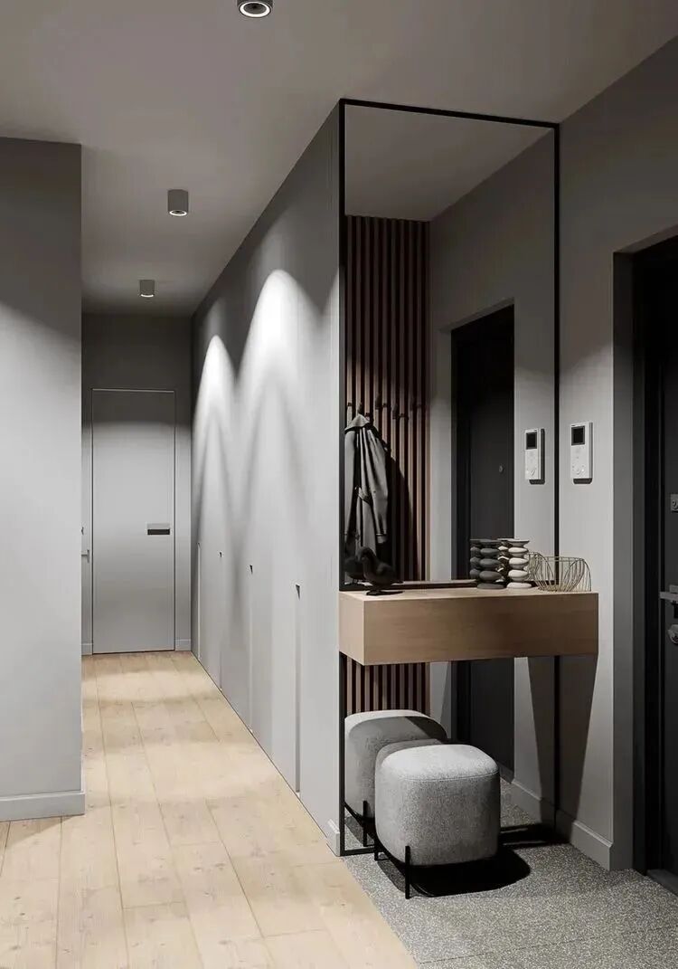 镜子不仅可以帮助我们整理自己的外表,还可以扩大空间。鞋凳和小型储物柜可满足日常的基本需求。
