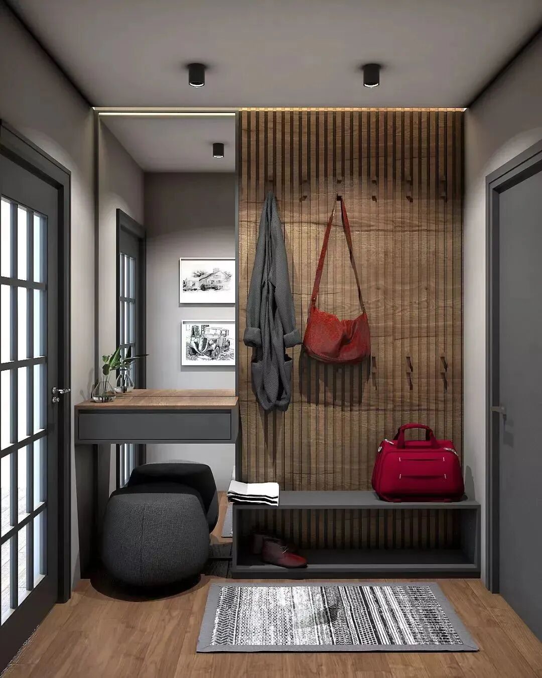 对于小户型,空间有限,不希望大型定制橱柜堵塞入口区域。可以考虑换鞋凳+小储物柜+镜子的组合设计。