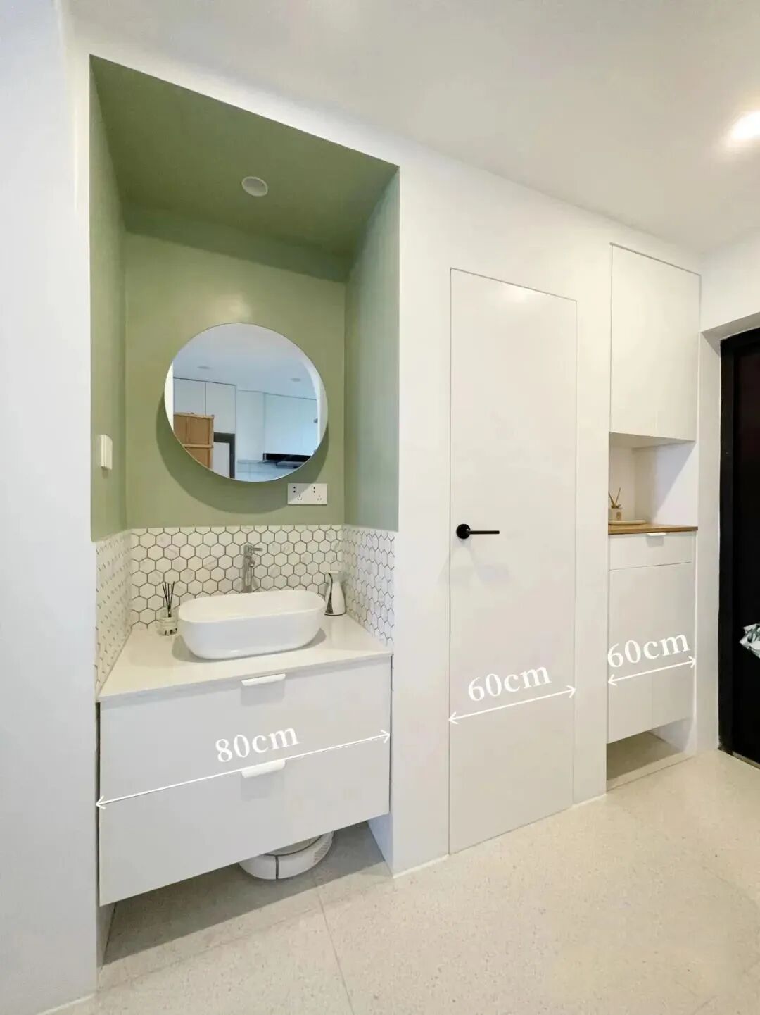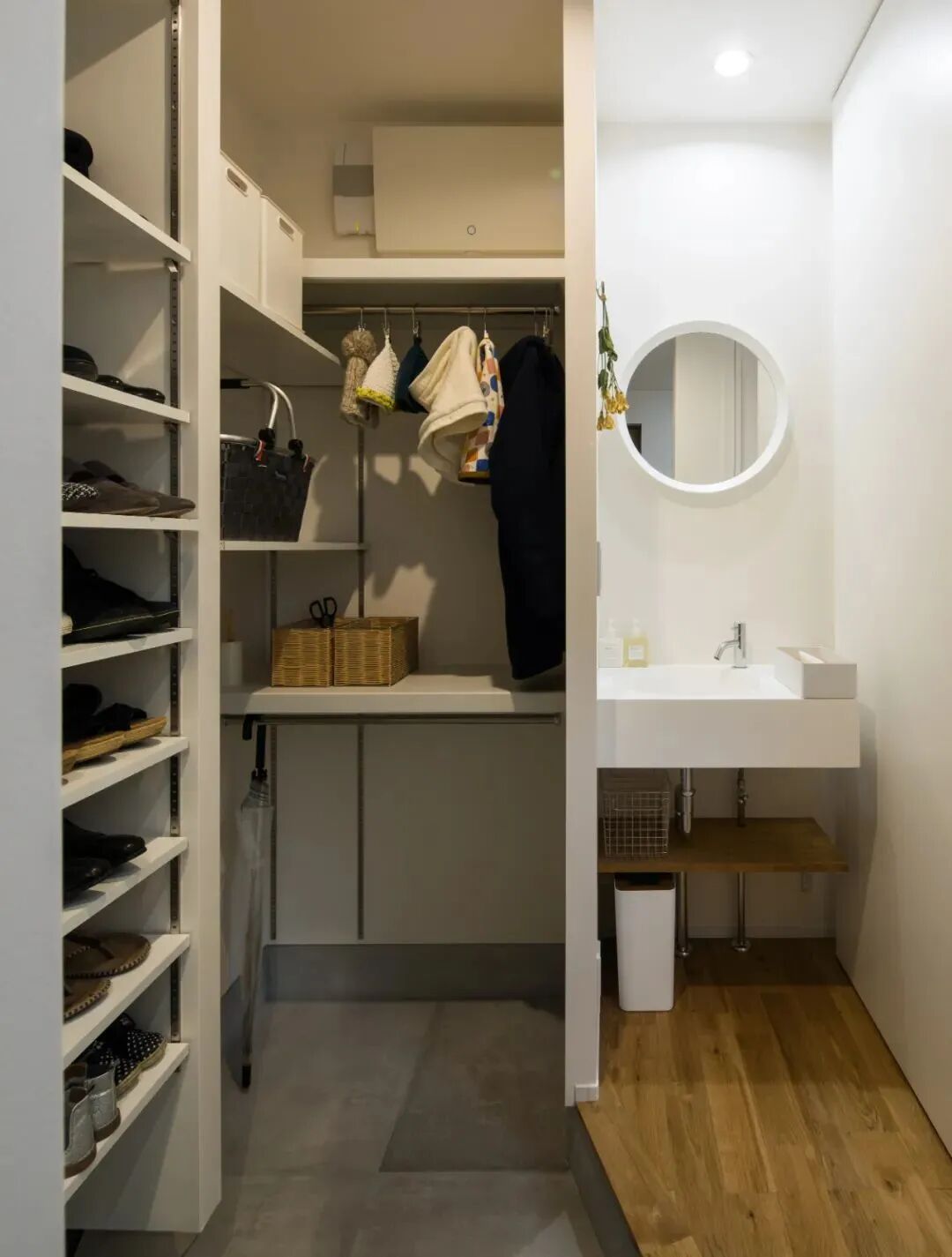 对于卫生间就在玄关附近的,简单,直接将台盆外移即可。我们每天从外边回家,手和脸肯定都很脏,在玄关附近设置洗手台,不仅可以出门前整理仪容,归家后能第一时间洗手洗脸,干净又安全。