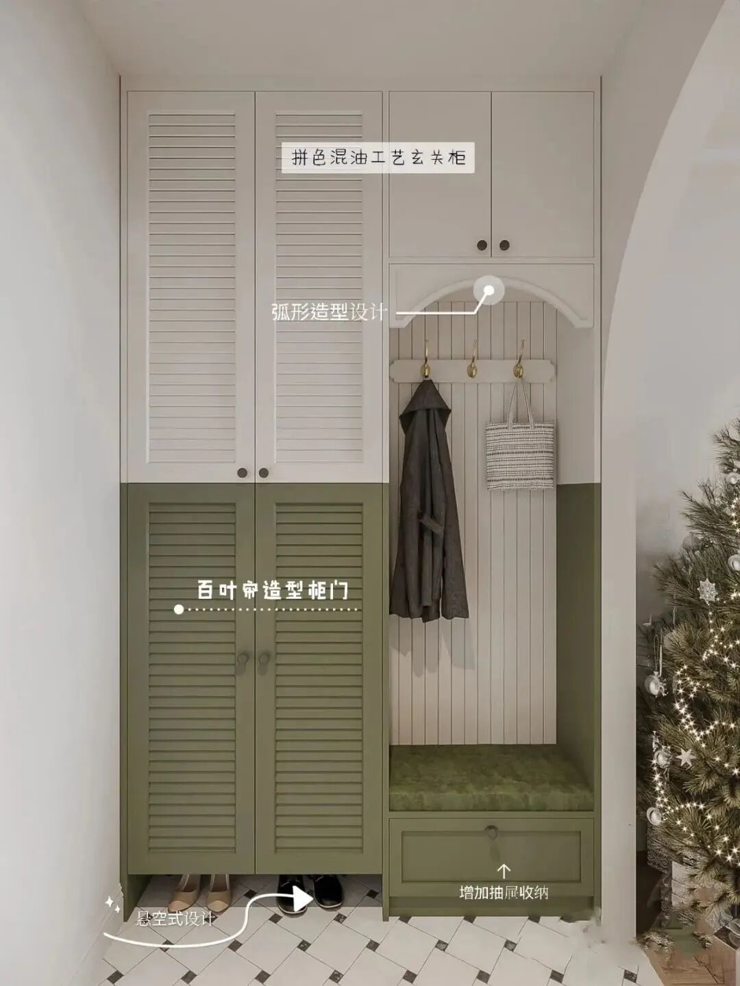 顶天立地柜子,上下都有柜门,但是中间部分是敞开的,和底部留出150-200mm的空位,用来收纳当天穿的鞋子和拖鞋是一个道理,这个敞开式的设计,也是为了留给高频放置的物品比如口罩、钥匙、洗手消毒液等常用物品,高度建议在35-60cm之间。