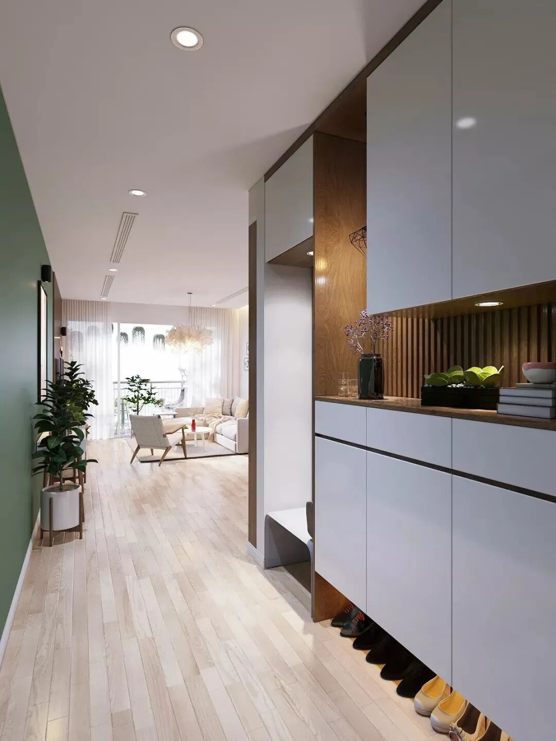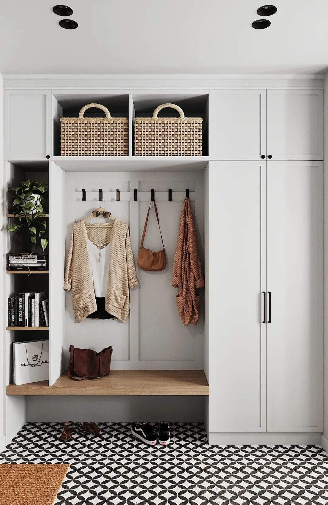 玄关处可与“顶天立地”柜结合,打造成多功能的收纳区域。日常鞋子收纳区、换鞋凳区、日常穿着衣物包包收纳区、口罩消毒物随手置物区、常用鞋收纳区及换季鞋收纳区。