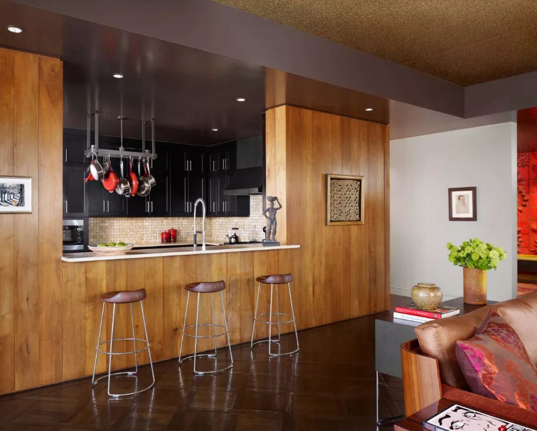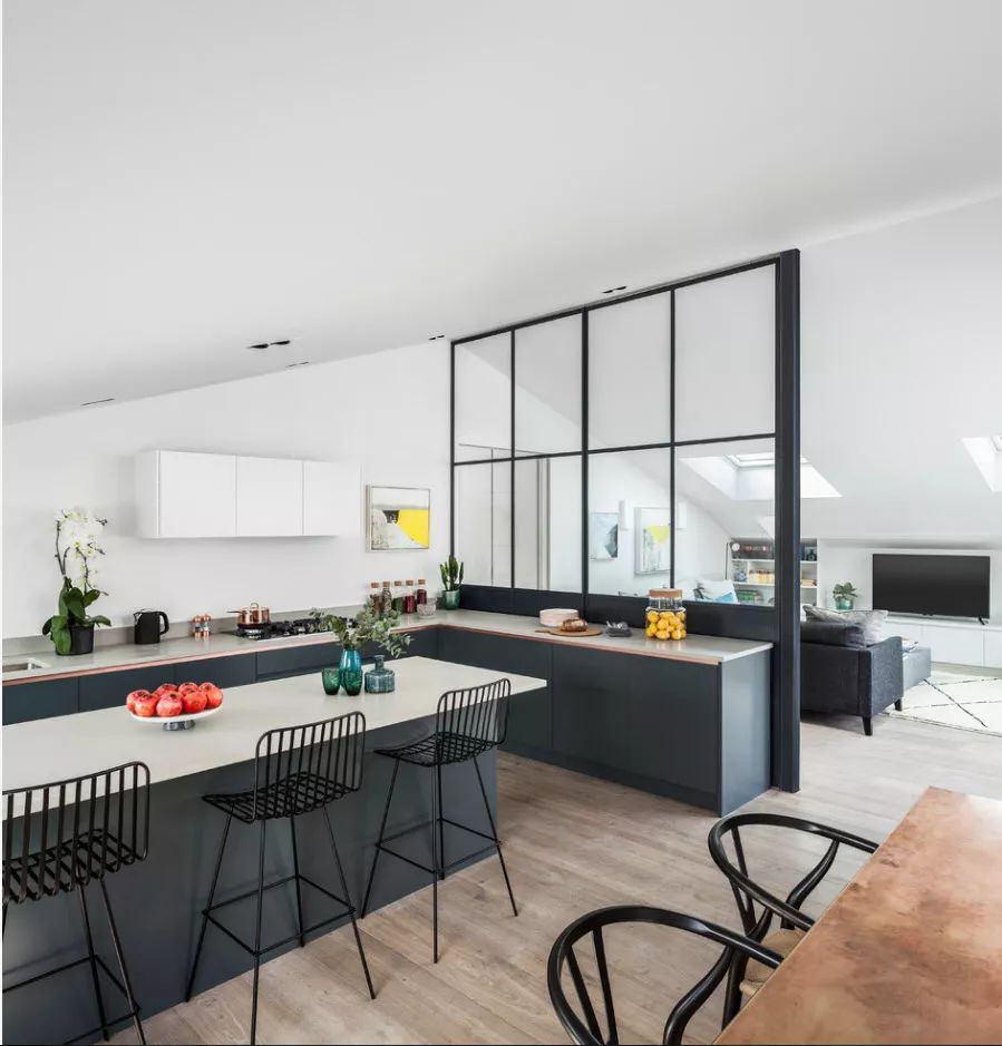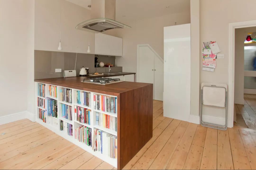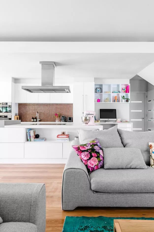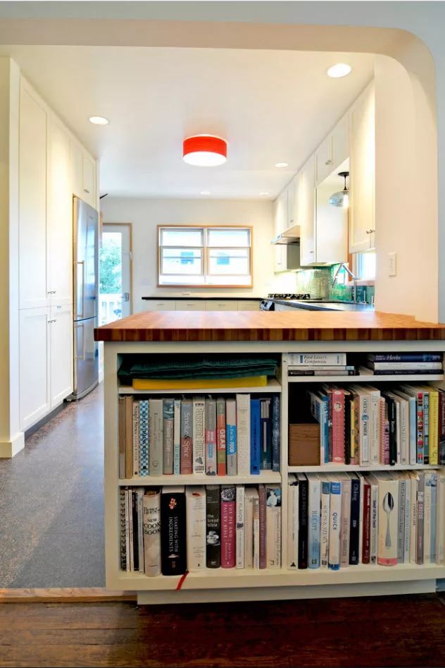还有一种让人喜欢的设计特点——把岛台作为一个连接点。从厨房的角度来看,可以用来存放或放置嵌入式家具,而在客厅一端,可以用作书架和小阅读角。