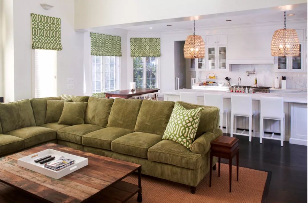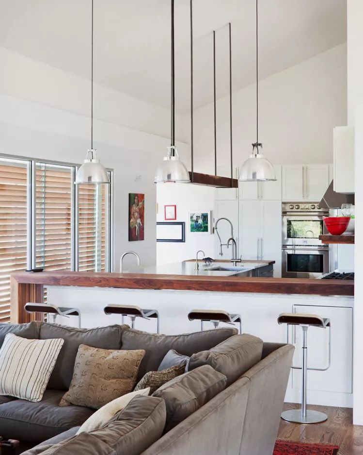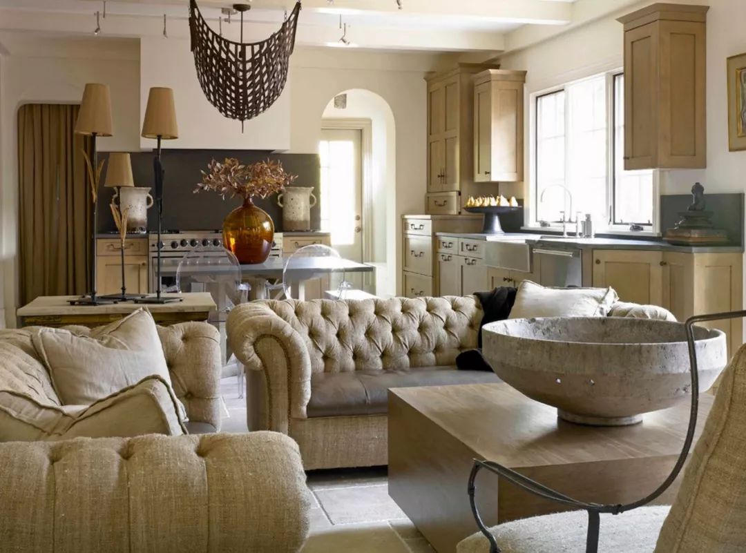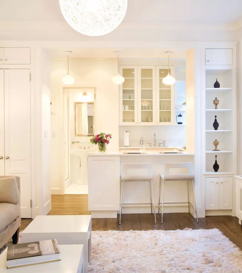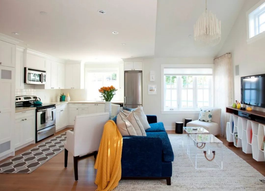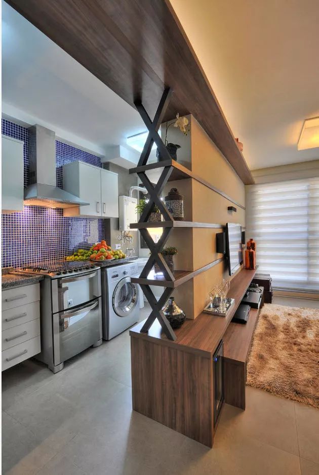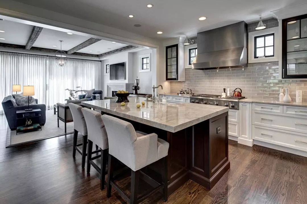 除此之外,将厨房与客厅的功能分区划分好,也很重要。如今,最流行的设计是用岛台将空间分成两部分,在大多数情况下,岛台的颜色与厨房的颜色相同,面向客厅的一侧可以添加更多装饰。