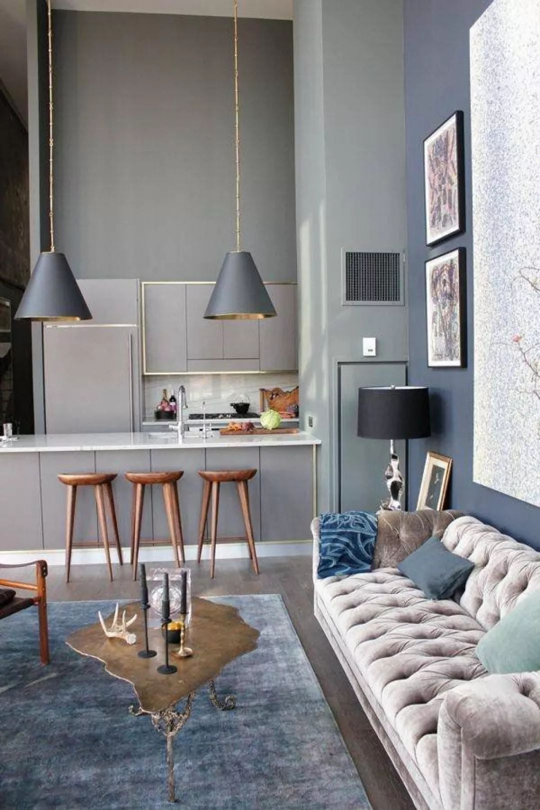 如果你的空间内层高可观,可以制造一个高低台落差,将厨房台面高于或低于客厅,制造出非常明显的功能界限。另外也可以在客厅空间铺上地毯,在视觉上形成对比。