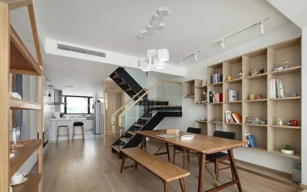 在开放客厅里摆一张超大的多功能桌,可以用来办公、聚会等;同时用到顶的书柜或储物柜取代电视柜,占满整个墙面,放置书籍或其它物品。