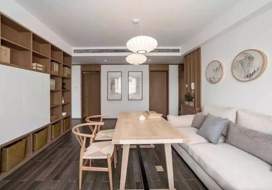 沙发可以不靠墙放,让空间更加灵活的同时,还能承担额外的其他功能。沙发后面可以做一整面储物柜、放一张餐桌或书桌、甚至能直接隔出另外一个房间。