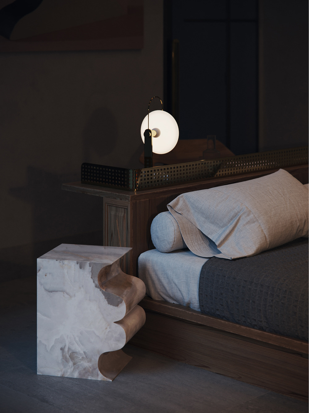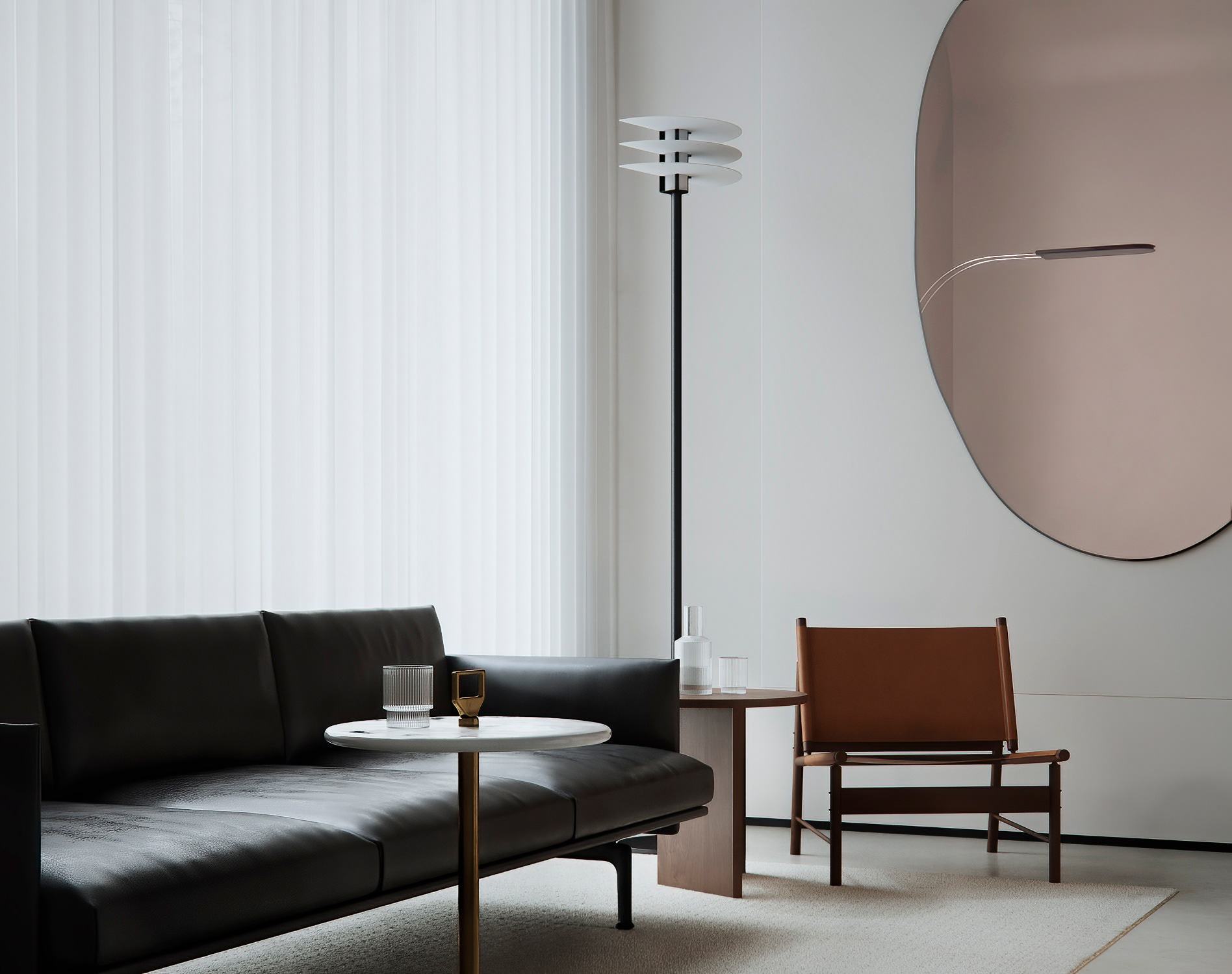落地灯与墙面圆形装置点缀空间,竖纹墙面+留白设计强化通透感,