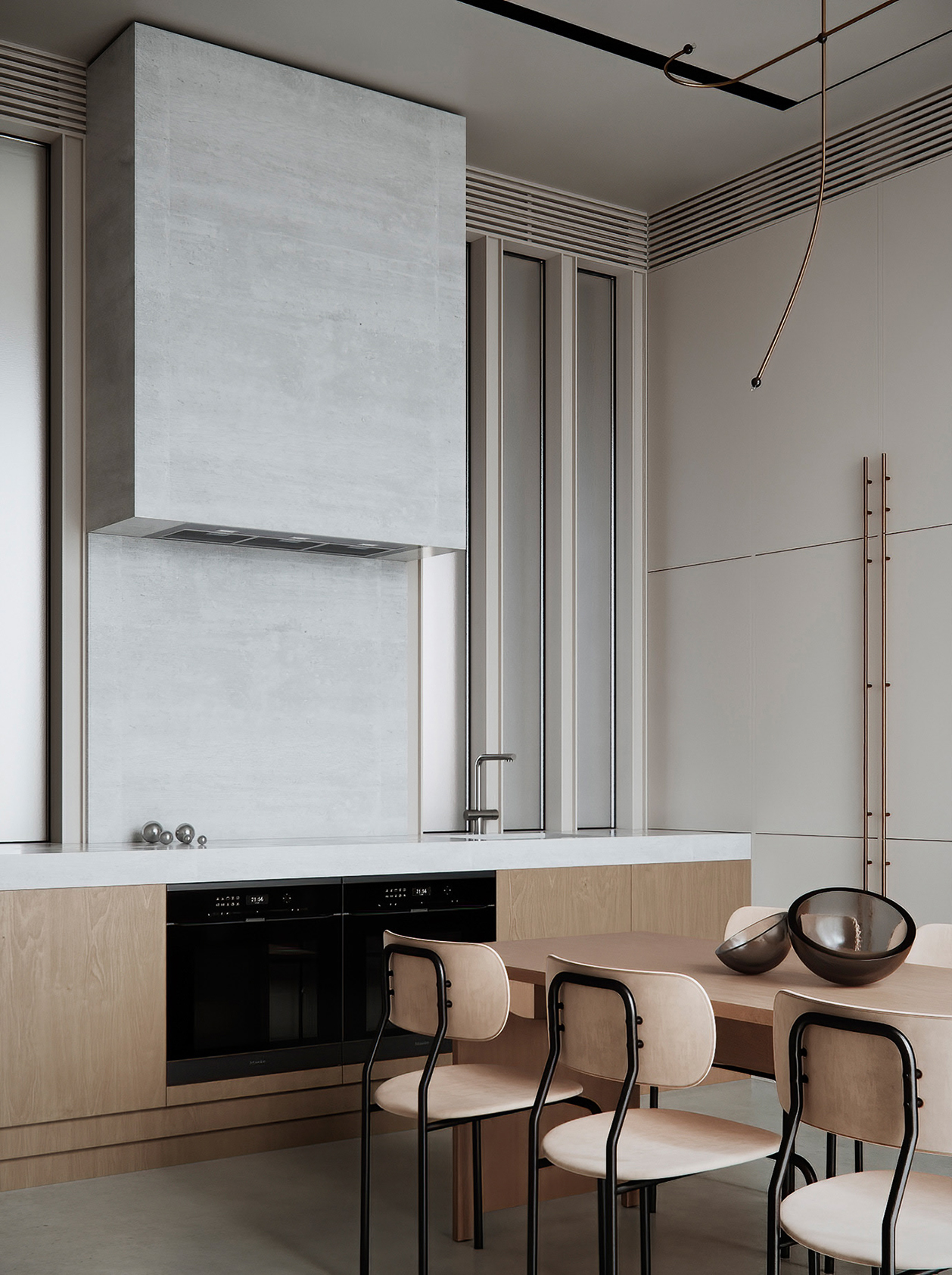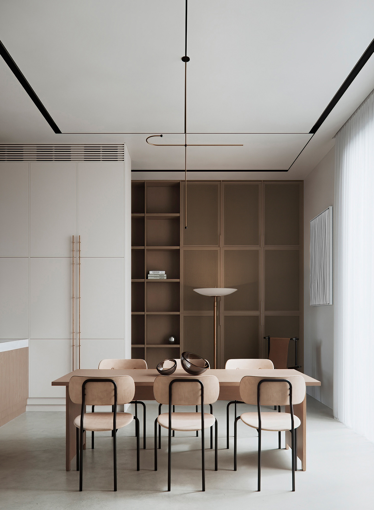 色调以米白、浅咖为主,搭配黑色金属线条,极简灯具与留白设计让空间通透简约。