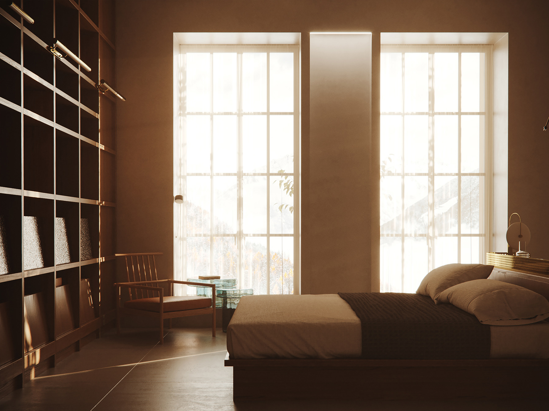 落地灯和格架点缀,打造出简约自然的独立休闲区。