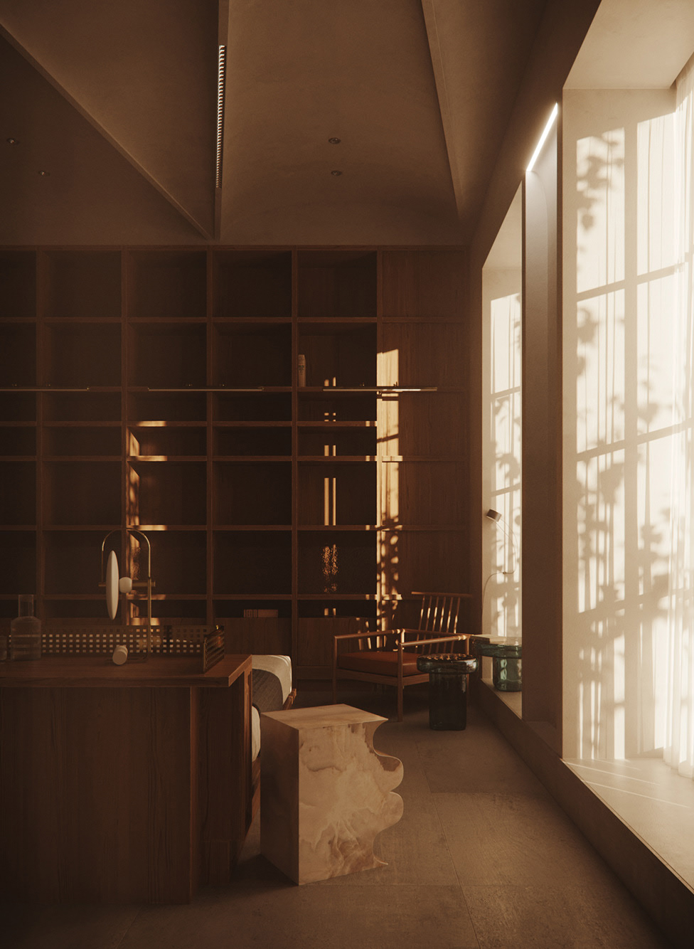 嵌入式灯带与落地灯营造出静谧的休憩氛围。
