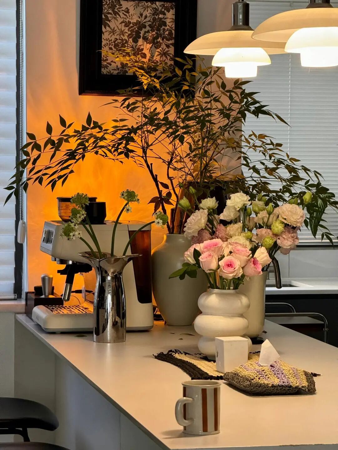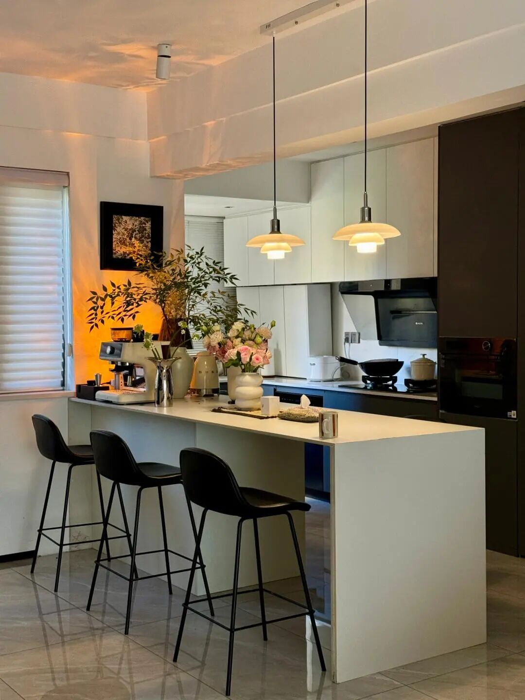 以花艺绿植作为点缀,增添自然生机;墙面挂置简约艺术挂画,搭配百叶窗引入柔和自然光,让空间兼具设计感与生活气息。