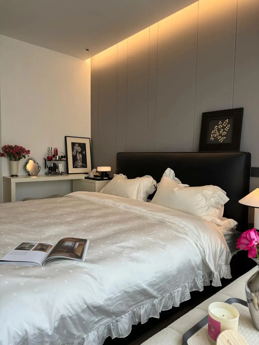 床头背景墙采用硬包拼接设计,浅灰色调搭配竖向线条,简洁又有质感;顶部做悬浮式吊顶并嵌入线性灯带,形成柔和的氛围光,替代传统主灯,营造静谧感。