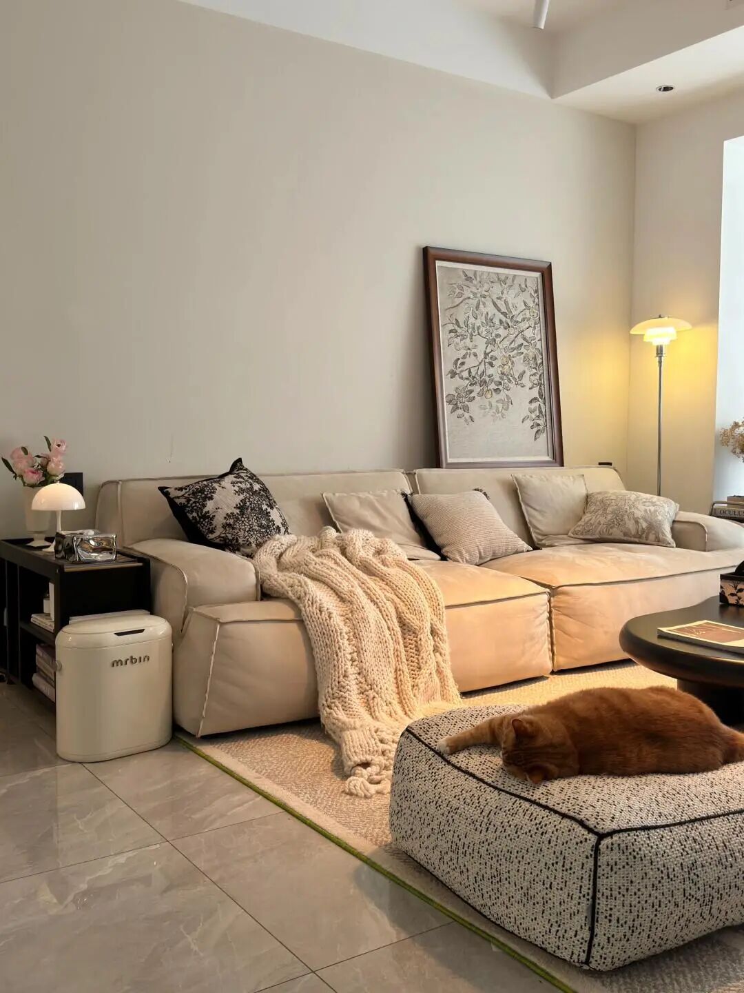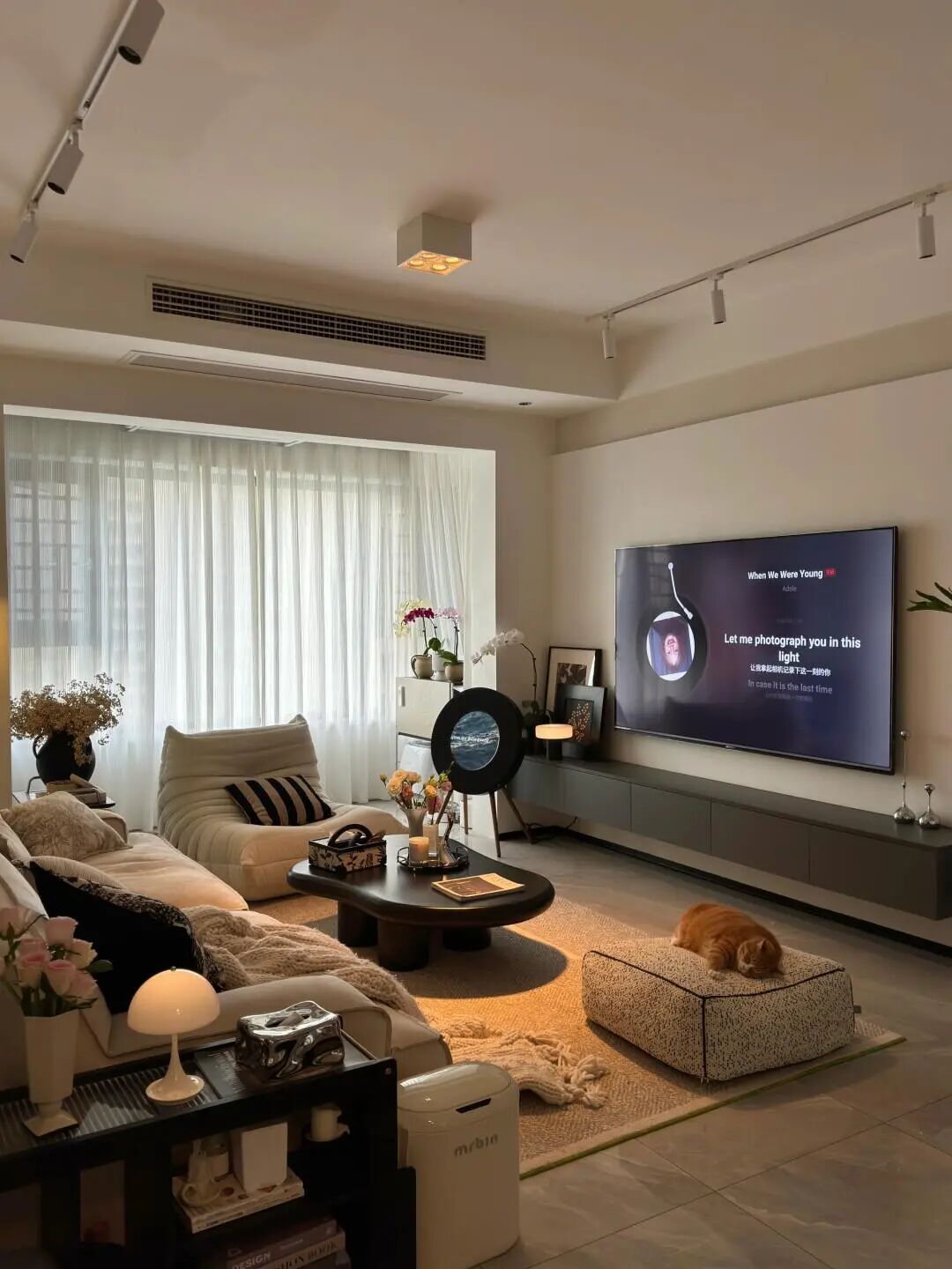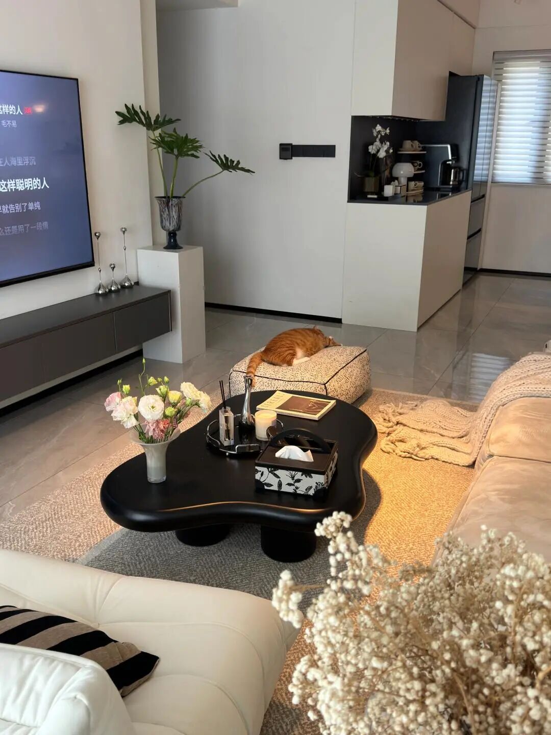 通过柔软的家具、暖光照明和宠物互动的场景,打造出舒适、治愈的居家氛围,弱化了设计的刻意感,更强调生活的松弛感。