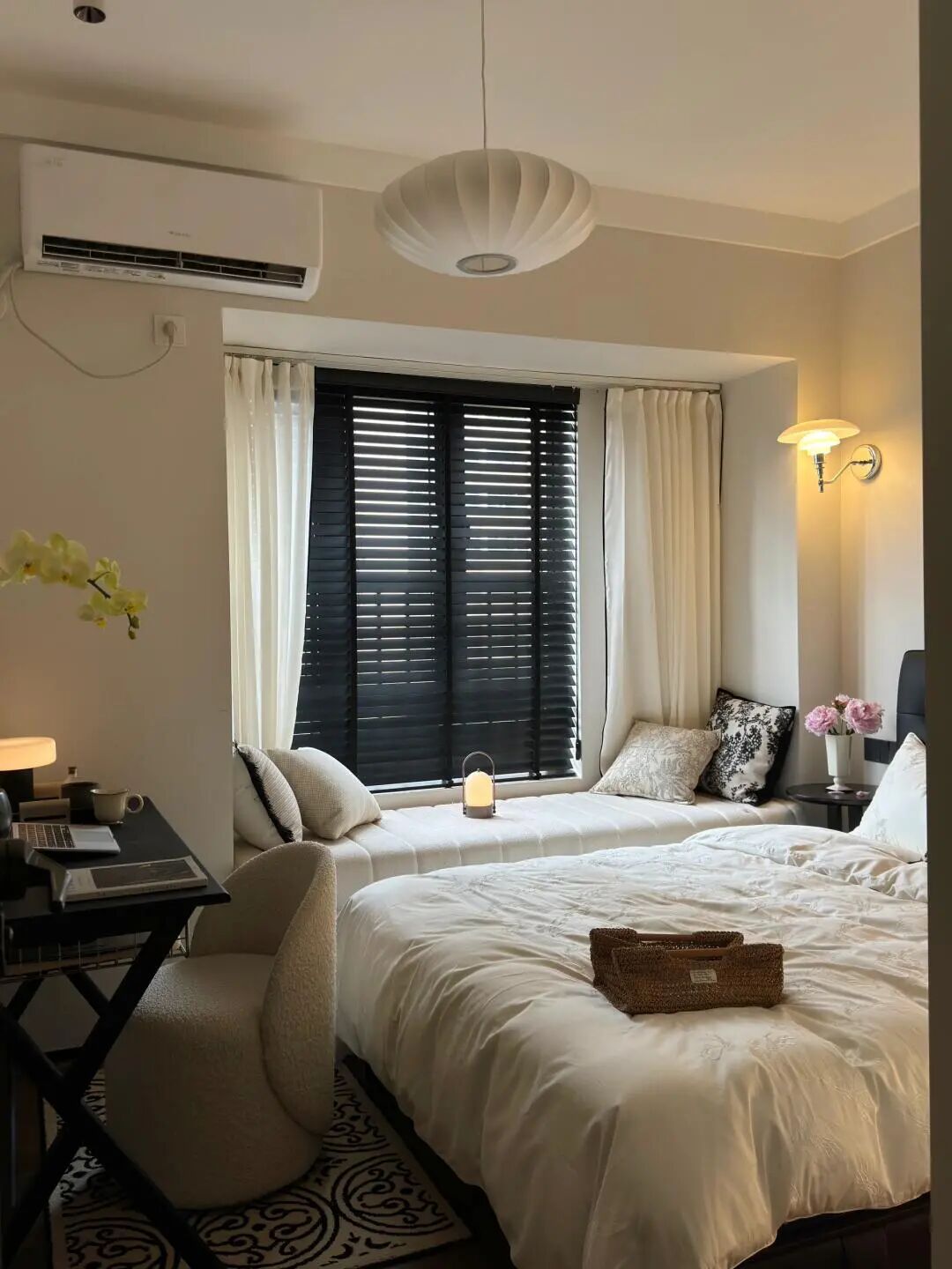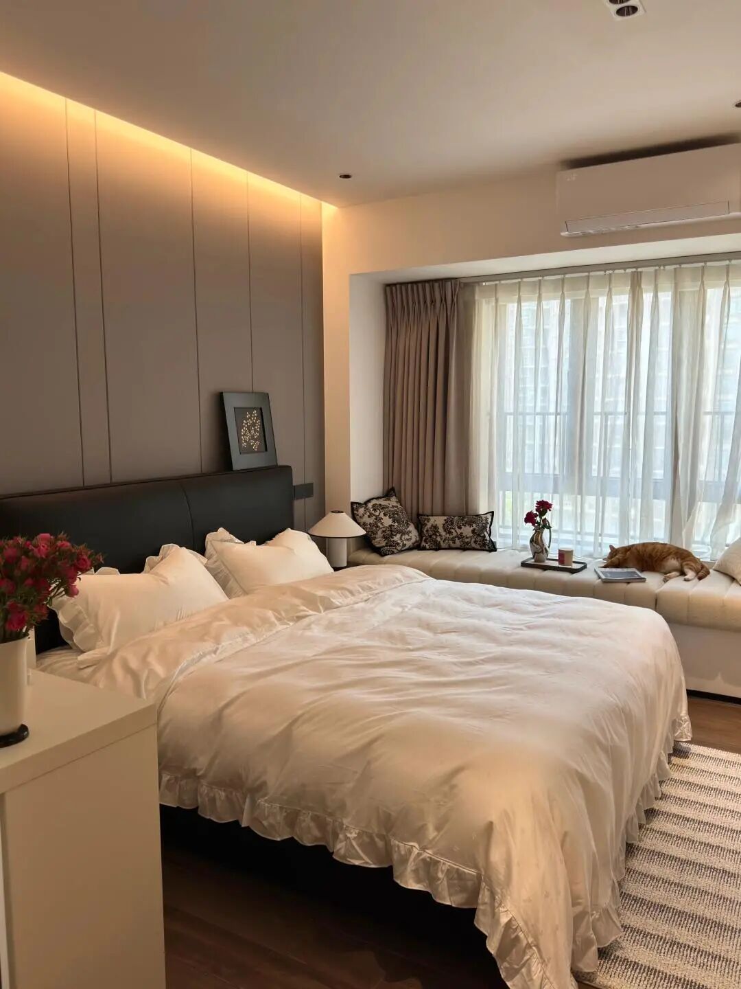 以白色、浅灰色为主色调,搭配深灰色床头软包形成层次;床品选用柔软的白色丝质面料,飘窗铺浅色系软垫,地面搭配条纹地毯,触感温润;木质地板则增添自然暖意。