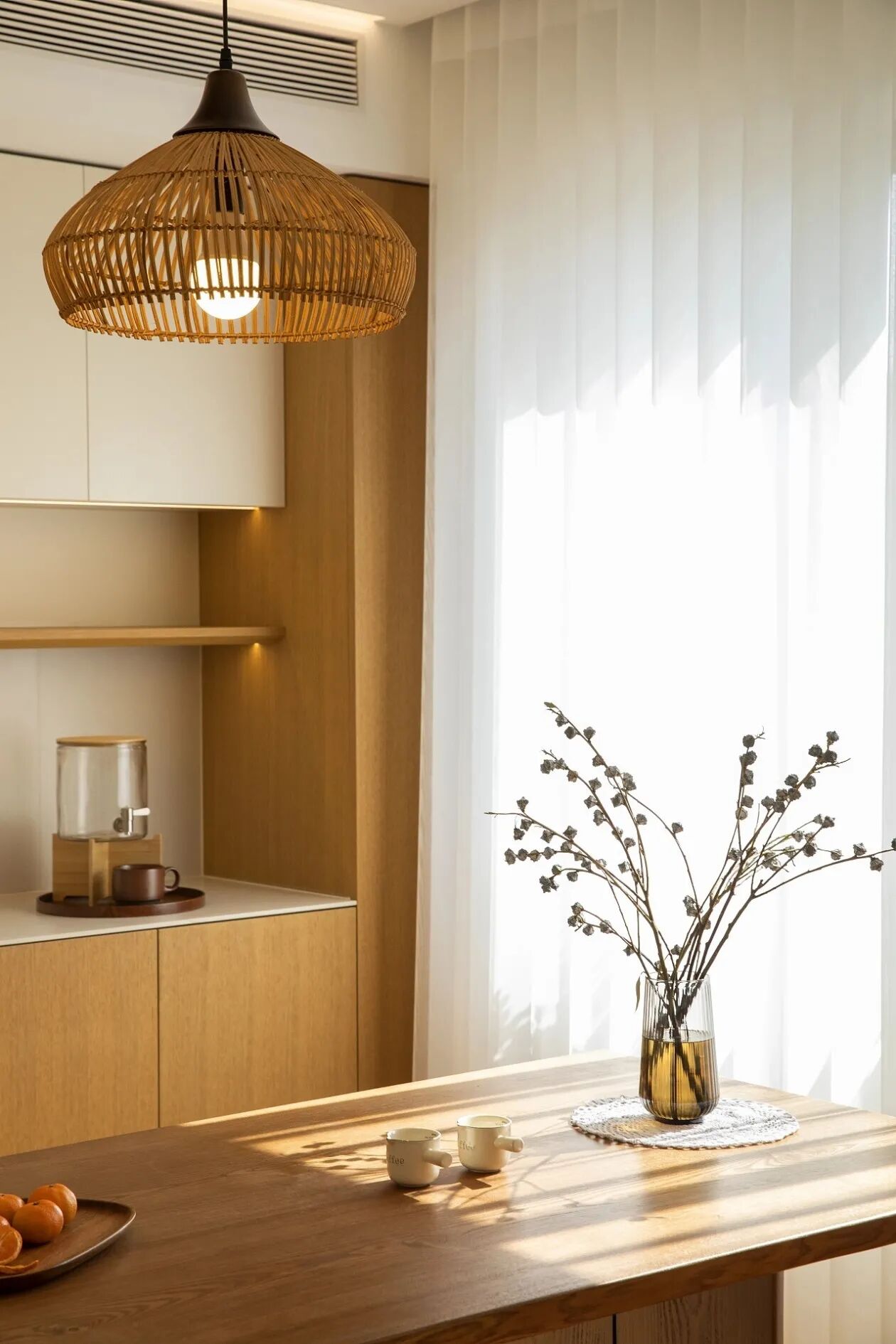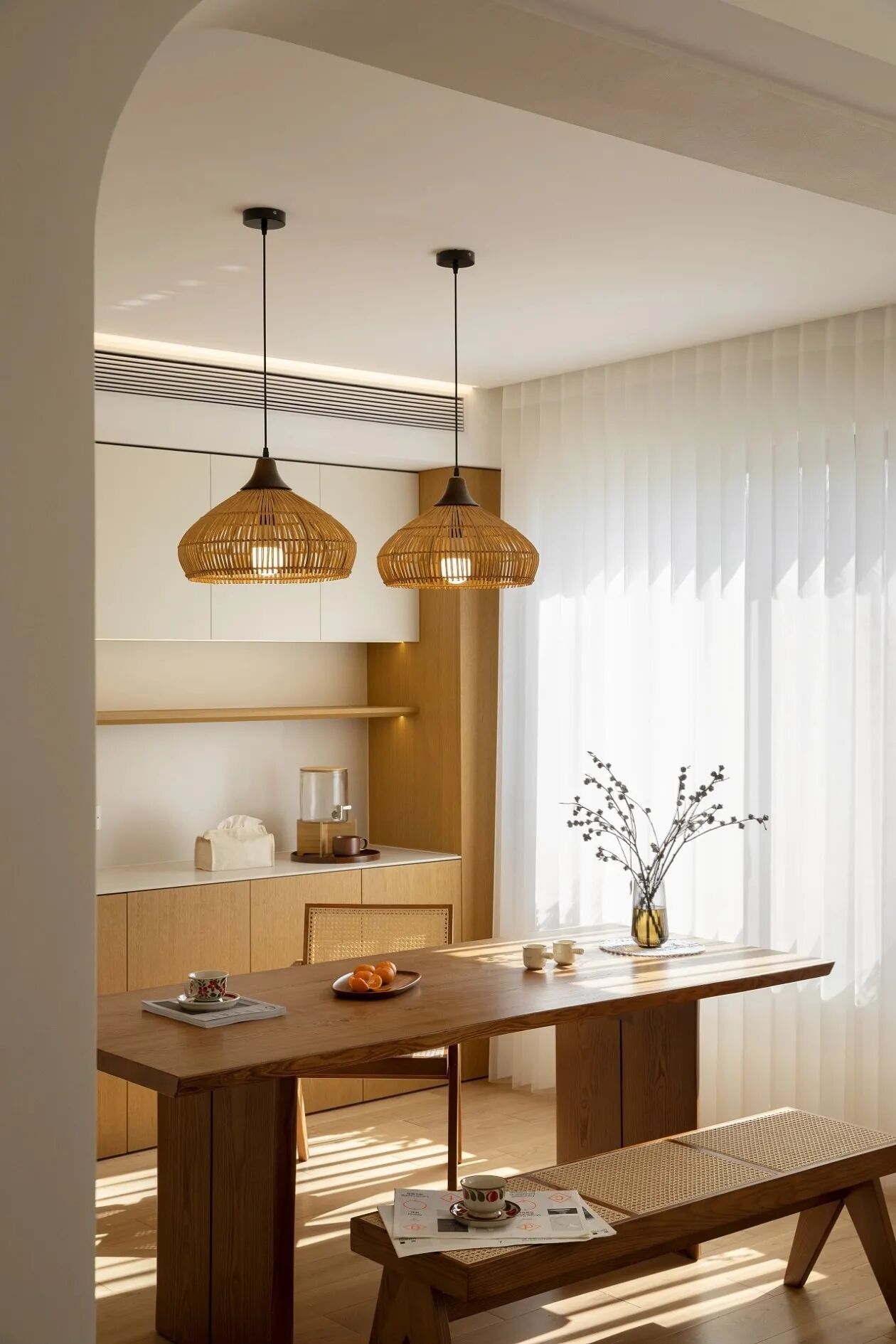 餐厅的原木餐桌搭配竹编吊灯,