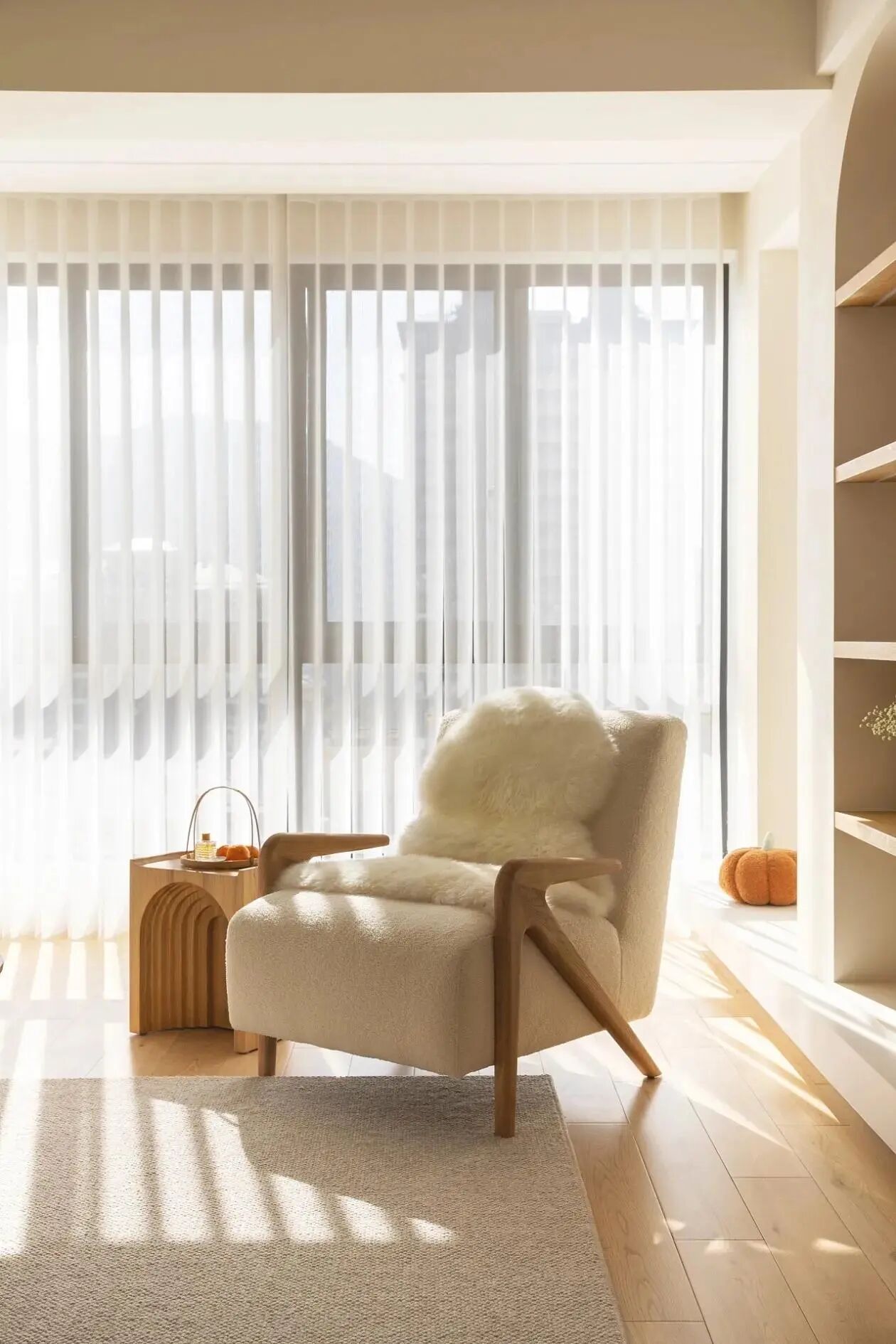 旁边的原木茶几自带温润质感