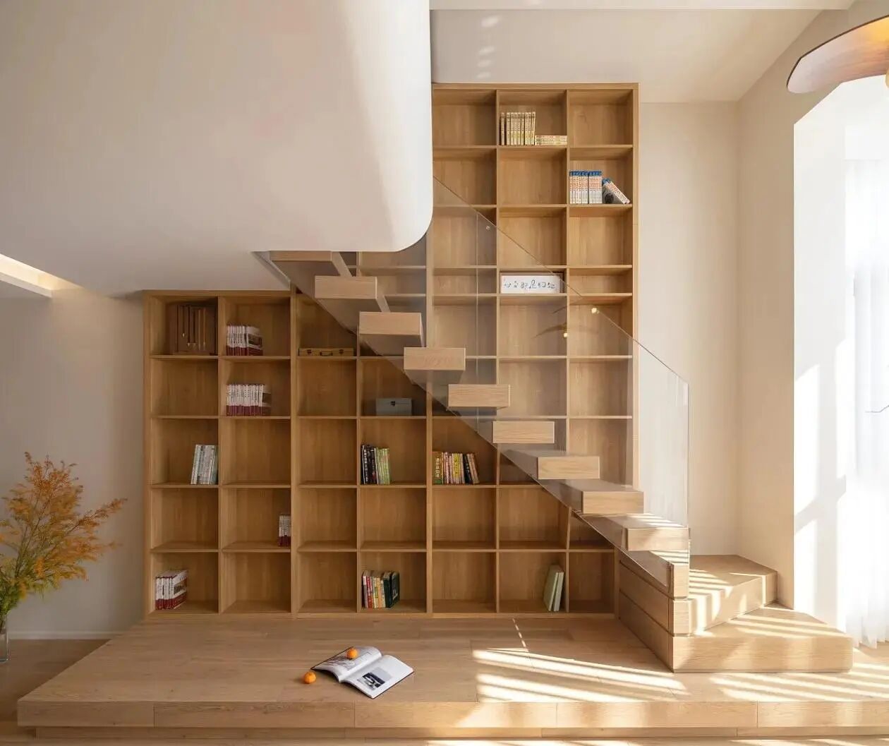 03书架+楼梯最戳我的是木质楼梯+正面整墙书架!楼梯踏步的木纹清晰可见,旁边的书架摆满喜欢的书和小摆件,下楼就能随手抽一本,这才是理想中的宅家生活啊~04卧室